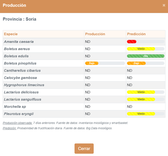 - PREDICCIÓN DE FRUCTIFICACIÓN: también se puede ver una predicción de la producción de fructificación para los próximos días en las especies objetivo. Así, puede verse si una zona tiene una predicción de fructificación muy probable, probable, poco probable o improbable para cada una de las 11 especies objetivo.